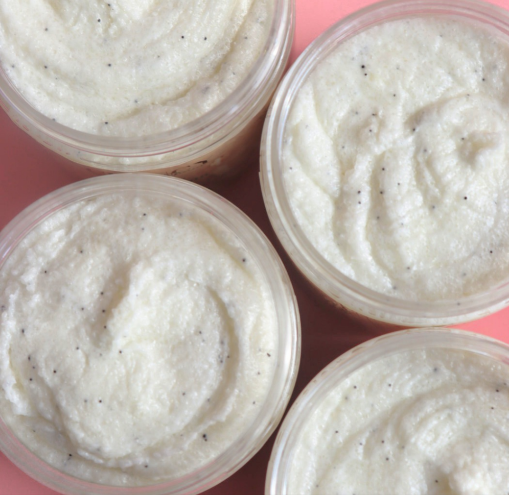 Sucrose (White Sugar), Persea Gratissma (Avocado) oil, Prunus Amygdalus Dulcis (Sweet Almond) oil, Cocos Nucifera (Coconut) oil, Butyrospermum Parkii (Organic Shea Butter), Garcinia Indica (Kokum Butter), Simmondsia Chinensis (Jojoba) oil, Aleurites Moluccana (Kukui) oil, Aroowroot Powder, Vitamin E, Hydrogenated Jojoba Wax (Black Jojoba Beads), Fragrance oil, Aqua, Glycerin, Sorbitol, Sodium Lauroyl Isethionate, Disodium Lauryl Sulfosuccinate, Sodium Chloride (Salt), Phenoxyethanol, Tetrasodium Etidronate und Liebe.